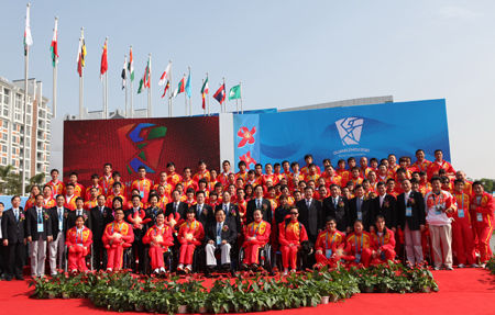 廣州亞運會勝利閉幕,運動員村并沒有“休息”,經(jīng)過4天緊鑼密鼓地轉(zhuǎn)場、準備,迎來了廣州亞殘運會的客人。8日,廣州2010年亞洲殘疾人運動會運動員村開村暨中國體育代表團入村歡迎儀式,在亞運城運動員村升旗廣場隆重舉行。中國殘聯(lián)黨組書記、理事長,中國殘奧委員會主席、廣州亞殘運會組委會執(zhí)行主席王新憲;中國殘聯(lián)黨組副書記、常務(wù)副理事長,廣州亞殘運會組委會副主席王乃坤女士;中國殘聯(lián)黨組成員、副主席,中國殘奧委員會執(zhí)行主席、廣州亞殘運會組委會副主席、中國體育代表團團長呂世明;國家體育總局黨組成員、副局長、中國殘奧委會執(zhí)行主席、廣州亞殘運會組委會副主席、中國體育代表團團長馮建中;中國殘聯(lián)黨組成員、副理事長、體育部主任,中國殘奧委員會常務(wù)副主席,廣州亞殘運會組委會副秘書長、中國體育代表團執(zhí)行團長賈勇;亞殘奧委會秘書長馬利尼·拉賈薩加蘭女士;廣東省委常委、廣州市委書記、廣州亞殘運會組委會副主席兼秘書長張廣寧;廣東省副省長、廣州亞殘運會組委會副主席林木聲;廣州市委副書記、廣州市市長、廣州亞殘運會組委會副主席萬慶良;廣州市委常委、亞運城賽區(qū)領(lǐng)導小組組長、運動員村村長孔少瓊女士;廣州市委常委、秘書長陳如桂;廣州市副市長、廣州亞殘運會組委會常務(wù)副秘書長許瑞生、廣州市副市長、廣州亞殘運會組委會副秘書長陳國和廣州市政府秘書長謝曉丹等領(lǐng)導和嘉賓,以及200名中國體育代表團成員出席了儀式。
