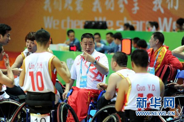 12月14日,中國(guó)男子輪椅籃球隊(duì)主教練翟永君(中)在對(duì)陣阿聯(lián)酋隊(duì)的比賽中為球員布置戰(zhàn)術(shù)。 52歲的翟永君是我國(guó)第一批輪椅籃球運(yùn)動(dòng)員,曾經(jīng)的主力國(guó)手。中國(guó)輪椅籃球的發(fā)展,只有短短23年的時(shí)間,為了提高此項(xiàng)競(jìng)技項(xiàng)目的水平,翟永君奉獻(xiàn)了寶貴的23年。新華社記者劉大偉攝