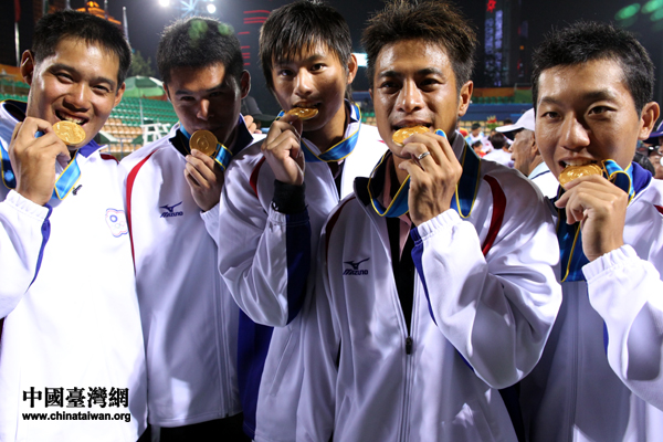 五位中華臺(tái)北隊(duì)選手親吻金牌。(中國(guó)臺(tái)灣網(wǎng) 鐘寶華 攝)
