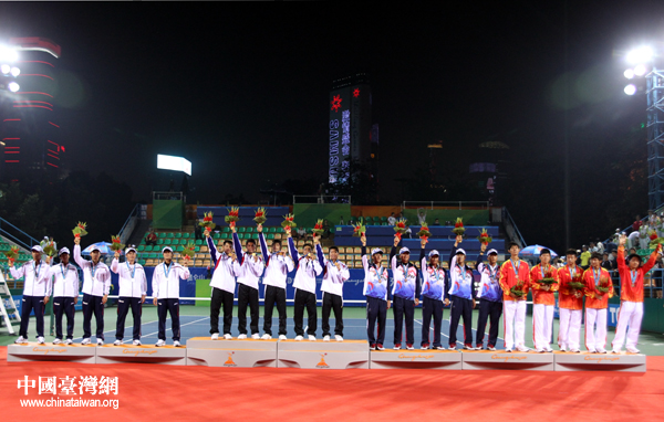 中華臺(tái)北隊(duì)軟式網(wǎng)球男團(tuán)奪金,站上最高領(lǐng)獎(jiǎng)臺(tái)。(中國(guó)臺(tái)灣網(wǎng) 鐘寶華 攝)