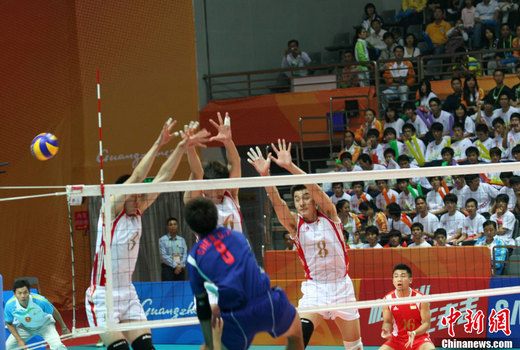 11月14日晚,在2010年廣州亞運(yùn)會(huì)男子排球小組賽第二輪比賽中,中國(guó)男排直落三局以3-0零封中華臺(tái)北男排,輕松獲得小組賽的兩連勝,三局比分是25-18、25-18和25-21。 中新社記者 鄧霞 攝