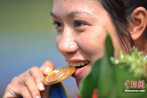 11月23日中午,亞運(yùn)會(huì)女子公路個(gè)人賽頒獎(jiǎng)儀式上,獲得金牌的中華臺(tái)北選手蕭美玉笑銜金牌,眼角還含著淚水。中新社記者 柯小軍 攝