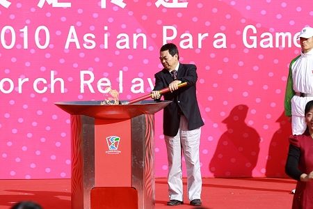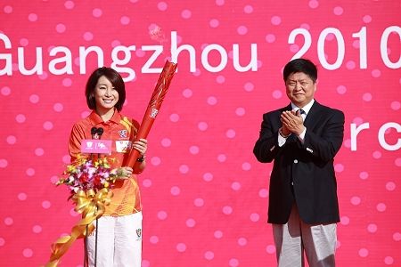 12月9日,廣州亞殘運會火炬?zhèn)鬟f活動進入第五天。上午9時34分,第一棒火炬手、國家話劇院國家一級演員、中國殘聯(lián)愛心大使秦海璐從廣州市委常委、廣州警備區(qū)司令員顏小明手中接過火炬,宣告?zhèn)鬟f活動正式開始。