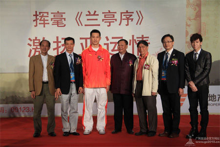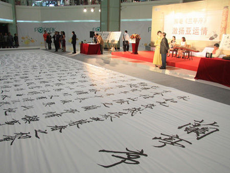 在活動現(xiàn)場,越秀地產(chǎn)總經(jīng)理梁由潘現(xiàn)場揮毫,寫下了巨幅《蘭亭序》作品,畫卷長達14米,面積約為100多平方米,整個過程行云流水,一氣呵成,作品氣勢磅礴。著名書法家盧有光和陳秋明也現(xiàn)場即興作詩聯(lián)句,書法作品充分彰顯亞運激情、亞殘運關愛。據(jù)了解,本次活動的部分書法作品將贈送給廣州亞殘運會組委會,預祝廣州亞殘運會順利舉辦。