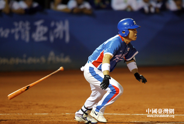 韓國(guó)隊(duì)隊(duì)員擊球命中后迅速跑壘。(中國(guó)臺(tái)灣網(wǎng) 鐘寶華 攝)