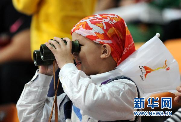 11月27日,頭戴“志愿彩”的小觀眾用望遠(yuǎn)鏡觀看閉幕式前的表演。當(dāng)日,第16屆亞運會閉幕式在廣州市海心沙島舉行。新華社記者李勇攝
