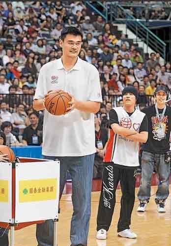 姚明在藝人投籃比賽時幫忙喂球,周杰倫站在后方觀看