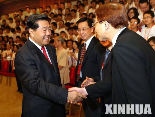 8月20日,中共中央政治局常委、全國政協(xié)主席賈慶林在北京會見參加“兩岸同胞攜手迎奧運”青年交流活動的全體代表。新華社記者 李濤 攝