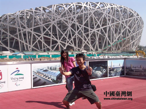 中國臺(tái)灣網(wǎng)8月22日北京消息 昨天距2008年北京奧運(yùn)會(huì)開幕還有353天,正在北京參加“兩岸同胞攜手迎奧運(yùn)”青年交流活動(dòng)的兩岸青年代表來到北京奧運(yùn)場館建設(shè)工地,參觀了建設(shè)中的國家體育場和國家游泳中心,親身感受越來越濃的奧運(yùn)氣息。