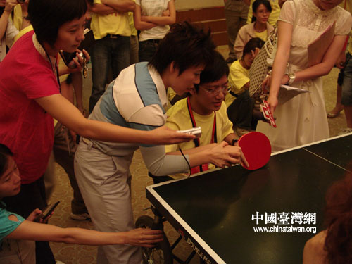 來自臺(tái)灣政治大學(xué)的湯紹成教授有備而來,自己準(zhǔn)備了球拍,在輸給鄧亞萍后仍然很開心,向記者表示:“今天能和世界冠軍打上一個(gè)回合我就已經(jīng)很開心了!