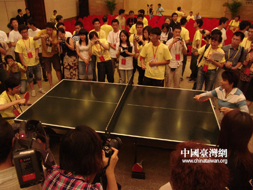 中國(guó)臺(tái)灣網(wǎng)8月23日北京消息 參加“兩岸青年攜手迎奧運(yùn)”交流活動(dòng)的代表們22日上午與三位奧運(yùn)會(huì)冠軍在北京齊聚一堂。兩岸青年與睿智善言的鄧亞萍、詼諧幽默的楊凌、美麗動(dòng)人的楊揚(yáng)交流并得以與之切磋球技。