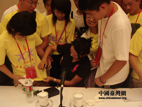 楊揚(yáng)也忙得不亦樂乎。她的身旁圍了許多爭(zhēng)著照相、索要簽名的青年代表們!皼]想到奧運(yùn)冠軍會(huì)那么漂亮!”,“她不像練體育的啊,更像是拍電影的,怎么看那么像趙雅芝!”,這樣的驚嘆不絕于耳。楊揚(yáng)一一滿足了大家的要求,并在短短的時(shí)間內(nèi)與臺(tái)灣青年代表們交上了朋友。