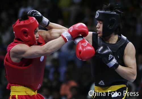 12月14日,多哈亞運(yùn)男子武術(shù)散手-65公斤級(jí)的比賽中,中國選手趙光勇摘金牌。圖為本次比賽精彩圖。