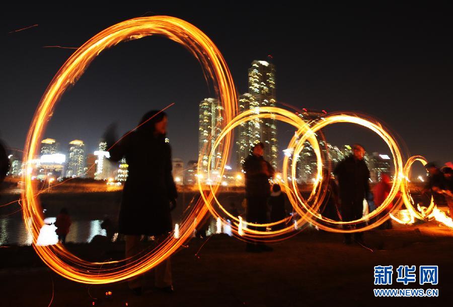 2月5日,在韓國首爾,人們?nèi)挤艧熁ㄓ.?dāng)日,為迎接即將到來的傳統(tǒng)節(jié)日——元宵節(jié),首爾居民舉行了多種慶;顒。在韓國,元宵節(jié)有很多風(fēng)俗,如吃年糕、五谷飯、花生、核桃等干果,喝耳明酒,“焚燒月亮屋”許愿,放風(fēng)箏、玩尤茨游戲等。新華社發(fā)(樸真熙攝)