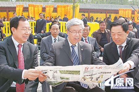 預(yù)演現(xiàn)場,中華炎黃文化研究會(huì)常務(wù)副會(huì)長張文彬,省政協(xié)主席王全書,省委常委、市委書記王文超閱讀《大河報(bào)》刊發(fā)的拜祖大典消息。記者 汪靜文 攝