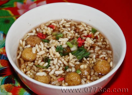 喝油茶必須配以各種佐食的小吃,都是各種油炸和炒香的食品。苗、瑤、侗等少數(shù)民族地區(qū)佐食多半是炒黃豆、炒花生米、爆玉米、炸花生米,再則就是糯米飯團(tuán)或糯米粉糍粑。恭城平樂一帶縣城佐食則較為考究,酥炸小吃往往在十?dāng)?shù)種以上,請(qǐng)客人喝油茶往往擺上一桌子的小吃,看起來(lái)就像請(qǐng)客吃飯。侗族以油茶敬客是一種禮節(jié),主人雙手捧茶敬客,并說(shuō)些謙恭的話,善歌者還以歌代言,客人必須喝完兩碗,才算給主人面子,也是取“好事成雙”之意。兩碗之后不想再喝,便將碗筷一并交給主人,如果只交碗不交筷,則表示還想繼續(xù)喝,主人就高高興興地再斟滿一碗油茶送到客人手里,幾鍎t在第一、二碗送來(lái)時(shí)不送筷子,并將米花、炒豆之類的小吃加入碗里。喝完碗里的茶還留些小吃在碗底,以示有余不盡,直到喝第三碗才送上筷子,所以客人必須喝三碗以上,只喝一兩碗,主人會(huì)不高興的。
