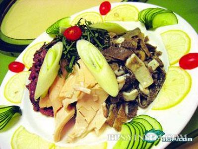 出品清淡,卻不掩本身的鮮味,清淡之中余味悠長(zhǎng),牛雜要的就是這份樸實(shí)。牛黃喉、牛百葉、牛筋、牛肚、牛肉等材料共聚一個(gè)大碟子里,周?chē)⒙渲咸K、青豆,絲毫不起眼。夾起一塊牛黃喉,牛雜特有的香味撲鼻而來(lái),入口細(xì)嚼,一股特別的味道在口腔里蔓延。檸檬!原來(lái)在烹制時(shí)加入了檸檬,使得牛雜本身厚重濃香的味道增加了一絲俏皮的感覺(jué),吃起來(lái)別有一番滋味。這牛雜嚼在嘴里仿如那剪不斷理還亂的糾纏,香味在口腔久久彌留。酒樓的老板介紹說(shuō),這牛雜可是添加了一種叫綠純香高級(jí)配料的,吃起來(lái)味道更加濃香,口感爽脆而不膩。而且選用的都是“不見(jiàn)光”牛雜,即當(dāng)天凌晨牛宰殺時(shí)就取用,牛雜到廚房了太陽(yáng)還沒(méi)出來(lái),可見(jiàn)其新鮮。