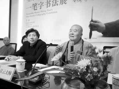 圖為星云大師(右)出席中國美術(shù)館舉行的書法展新聞發(fā)布會(huì)。趙永琦攝