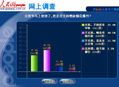 截至14日22時,共有9125人次參與了調(diào)查,選擇“不支持”的網(wǎng)友超過了六成。其中,48.5%的網(wǎng)友(4425票)選擇“不支持。噪音環(huán)境污染”;11.9%的網(wǎng)友(1085票)持“不支持”態(tài)度,是因為“易發(fā)生火災(zāi)等”。選擇“支持。不放沒有年味”選項的網(wǎng)友只占到了37.4%(3411票)認為。此外,還有2.2%的網(wǎng)友(204票)認為“無所謂。放不放都行”。