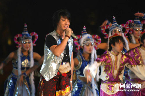 備受矚目的“山莊月·中華情”2007中秋晚會將于今晚在承德避暑山莊舉行。24日晚,劇組進行了最后彩排。圖為藏族好男兒蒲巴甲載歌載舞。(中國臺灣發(fā))