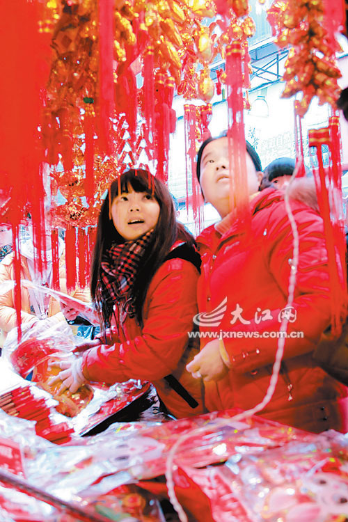 在南昌市萬(wàn)壽宮商城,記者看到,各家春聯(lián)、飾品店生意都非常紅火。特別是中國(guó)結(jié)和各式各樣的兔子造型飾品,深受市民喜愛(ài)。一對(duì)夫妻拎著兩大袋裝飾品,還在喜滋滋地逛著。這對(duì)夫妻,剛買了新房,兔年將在新房子里過(guò)第一個(gè)新春佳節(jié)。“看著新家,打心眼里舒服,得好好布置布置,一家人高興高興。”