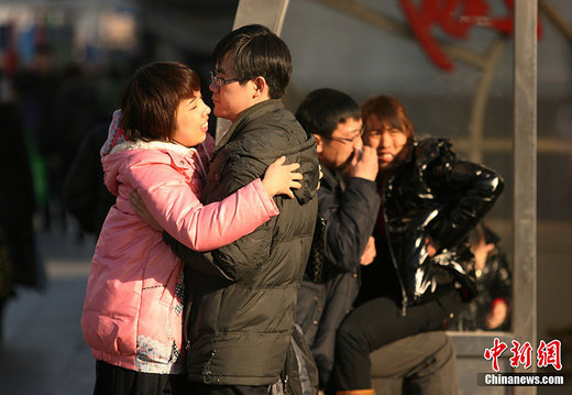 1月31日,兩對情侶在北京西站等候上車。據(jù)悉,春運前11天,中國道路客運量達到7.61億人次,同比增長13%。中新社記者 蘇丹 攝