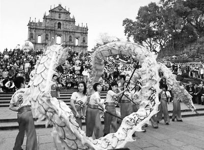 春節(jié)臨近,又有許多內(nèi)地游客計劃赴港澳旅游,每年春節(jié)澳門標(biāo)志性建筑“大三巴”前都會有傳統(tǒng)的舞龍表演。 (資料圖片)