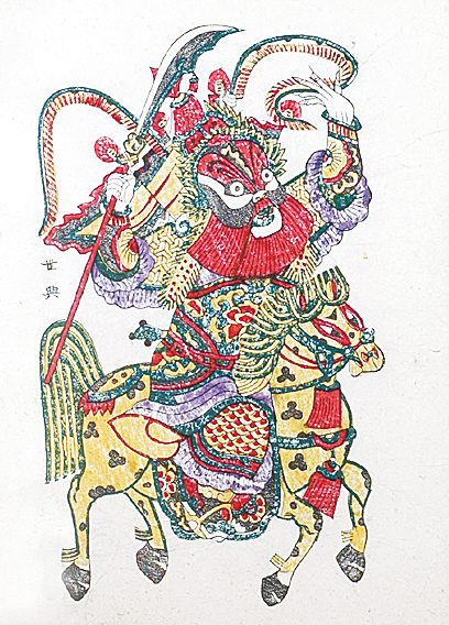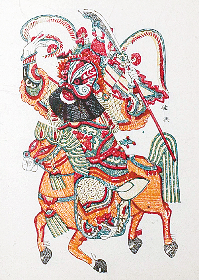鳳翔年畫是西北地區(qū)的代表性年畫,源于宋盛于清,是千百年來西北地區(qū)民俗民情的藝術(shù)反映。在雕刻藝術(shù)上,鳳翔年畫繼承了秦漢唐宋石刻和壁畫藝術(shù)端莊樸實(shí)、凝重大方的特點(diǎn),揉進(jìn)了本地刺繡剪紙的造型技巧,并借鑒了秦腔的表演藝術(shù)風(fēng)格,強(qiáng)調(diào)夸張和變形,畫面粗獷豪放而又鮮活靈動(dòng)。鳳翔年畫工藝流程復(fù)雜,從畫墨線稿到印刷要經(jīng)過十三四道工序。由于地處西北受外部影響少,它保持了古版年畫的純粹民間風(fēng)格,無論是人物還是花卉,造型都生動(dòng)逼真。例如騎馬的秦瓊門神畫就吸收了秦腔臉譜的變形藝術(shù),人物雙眉直豎、雙眼噴火,下巴夸張變寬,具有殺氣騰騰、鎮(zhèn)妖除邪的威風(fēng)感。