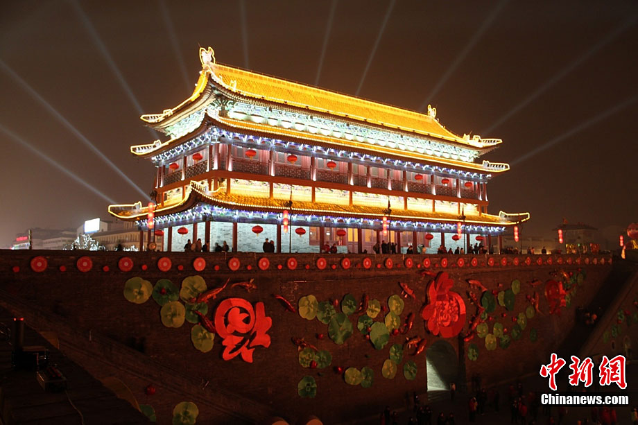 1月26日晚,“西安大廟會(huì)·城墻上元燈會(huì)暨成都國(guó)際熊貓燈會(huì)”在西安點(diǎn)亮。圖為流光溢彩的燈會(huì)。中新社發(fā) 金鑫 攝