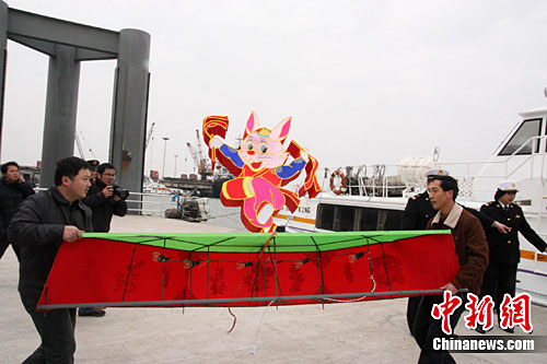 中新網(wǎng)南安2月14日電 (林永傳 郭斌)14日下午,伴隨陣陣的汽笛聲,30盞大型傳統(tǒng)花燈帶著大陸鄉(xiāng)親對(duì)金門鄉(xiāng)親的祝福,通過(guò)泉金航線啟程前往金門參加“2011年金門花燈會(huì)”。