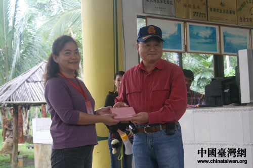 海南臺(tái)商林保森接受臺(tái)灣政治大學(xué)代表贈(zèng)送的紀(jì)念品