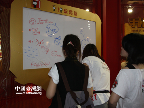 漫迷們在閱悅題板上涂鴉(中國臺灣網(wǎng) 李丹 攝)