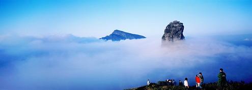 梵凈山很奇特、險峻,尤其引人入勝的是新金頂,在海拔約2200余米的崇山峻嶺上,突起一個山峰,像陽朔的丹霞一樣,但是,只有一個,高約100米,如巨筍出土,常常紅云環(huán)繞(哈蘇6x6的片子有反映,另貼),直插蒼宇,令人震撼。1618年,奉圣旨立碑曰:“眾名岳之宗”,可見梵凈山在皇帝眼里的位置了。