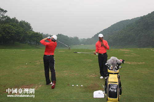 高爾夫教練為記者們做現(xiàn)場演示(中國臺灣網(wǎng) 趙輝 攝)