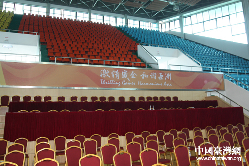 東莞體育館內(nèi)部,廣州亞運(yùn)會(huì)舉重比賽15枚舉重比賽的金牌將在此決出(中國(guó)臺(tái)灣網(wǎng) 趙輝 攝)