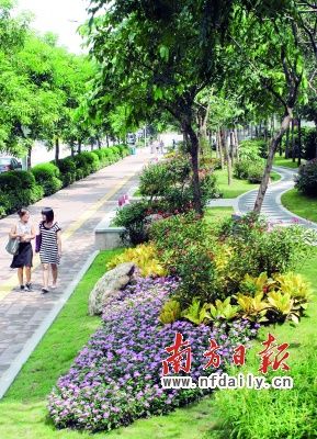 廣州大道、臨江大道原來都是“有綠無景”,樹木生長茂盛,卻談不上什么景觀。改造后,把樹木抽疏,使景觀豁然開朗;用小土坡營造“微地形”,使視覺變化更豐富;植物高地錯落,營造出豐富的層次;花卉四季搭配,一年中“花開不敗”。綠化帶中增加了彎彎曲曲的園路,行至其中,一花一石都頗具嶺南園林的風(fēng)格。
