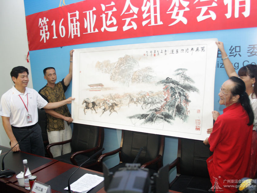 劉江南在致辭中說,廣州亞組委曾向全亞洲人民做出承諾,不僅要將本屆亞運(yùn)會(huì)辦成精彩紛呈的體育盛會(huì),也要辦成傳承奧林匹克精神、融合亞洲各地區(qū)文化,同時(shí)彰顯中國傳統(tǒng)文化的一次文化盛會(huì)。國畫家張松濤將親筆之作《萬馬奔騰迎亞運(yùn)》捐獻(xiàn)給廣州亞組委,不僅表達(dá)了他對廣州亞運(yùn)的一片深情,更將中國傳統(tǒng)文化帶到國際舞臺,為彰顯中國文化和嶺南文化做出了貢獻(xiàn)。