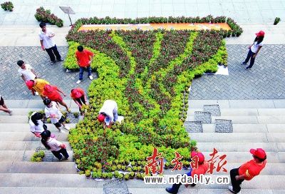 南方日報(bào)9月21日報(bào)道9月18日,在學(xué)生代表及眾多市民的參與下,用廣州市民親手種植的2010盆愛心亞運(yùn)花卉拼砌而成的亞運(yùn)會徽“五羊圣火”誕生。