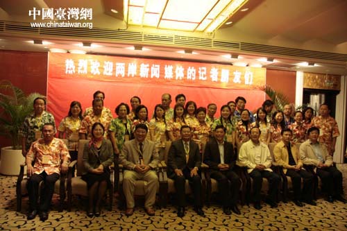 中國(guó)臺(tái)灣網(wǎng)11月29日海口消息 “兩岸媒體海南行”采訪活動(dòng)28日在?谡絾(dòng)。兩岸共有40余名記者參加了此次活動(dòng),其中臺(tái)灣12家媒體的24名記者全部來(lái)自臺(tái)灣南部。圖為臺(tái)灣記者身穿被海南人冠以“島服”名稱的海島旅游休閑服與海南省有關(guān)領(lǐng)導(dǎo)合影。(李杰)