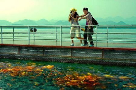 吉祥魚在魚樂橋上。魚樂橋也是一座水上浮橋,浮橋中間水池內(nèi)放養(yǎng)著78種千島湖淡水魚,其中鯉魚爭食是這里的一大奇觀。千島湖中體型最大、分量最重的螺螄青就放養(yǎng)于此,陪伴它的,還有號稱“白娘子”的大白鳙魚。