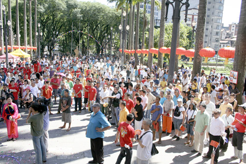 6日上午,圣保羅市中心SE 廣場(chǎng)四周懸掛數(shù)十個(gè)巨型大紅燈籠,古老的大教堂前臨時(shí)搭起了舞臺(tái),臺(tái)上貼有中國(guó)春聯(lián)掛有中國(guó)結(jié)等節(jié)日吉祥物,組合音響播放著喜慶的中國(guó)民樂,廣場(chǎng)一側(cè)設(shè)有中國(guó)文化藝術(shù)攤位,廣場(chǎng)上一派節(jié)日的歡快喜慶景象。