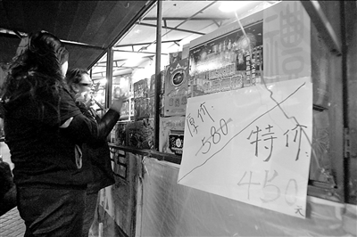 2月8日,朝陽區(qū)靜安市場煙花售賣處張貼出煙花打折的招牌。周民攝