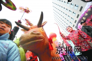 金寶街上,歡快的鑼鼓響起,兩千多個(gè)風(fēng)車(chē)嘩啦啦作響,迎春祈;顒(dòng)開(kāi)始。一頭由北京泥塑藝術(shù)家雙彥制作的塑鋼黃牛佇立在街頭。“這頭牛身長(zhǎng)三尺六寸五,象征一年365天;牛尾長(zhǎng)一尺二寸,象征一年12個(gè)月;四蹄象征四季;柳條象征春天。我們是依照民俗專(zhuān)家的建議,按古人的方法制作的!苯▏(guó)門(mén)工委書(shū)記王紅一臉喜氣地介紹。