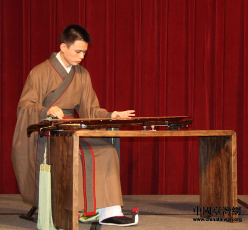 北京孔廟和國子監(jiān)博物館工作人員為兩岸師生表演古琴。(中國臺(tái)灣網(wǎng) 李杰 攝)