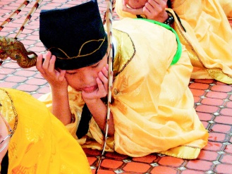 宜蘭縣孔廟祭孔活動(dòng),一名六佾舞舞生因跪太久了,索性用手撐著頭,小憩片刻,忙里偷閑一番。來源:臺(tái)灣《聯(lián)合報(bào)》