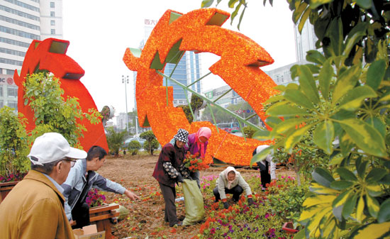 6月2日,工作人員在青海省城中心廣場(chǎng)布置裝飾街頭景觀(guān),營(yíng)造良好的城市環(huán)境,迎接青洽會(huì)的到來(lái)。本報(bào)記者祁國(guó)彪攝