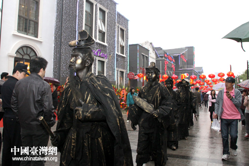 為期17天的“2011北京臺灣文化藝術節(jié)”將推出系列展演活動,圖為涂繪成秦朝將士的演員在北京臺灣街行進,吸引了眾多路人眼球。(中國臺灣網 普燕 攝)