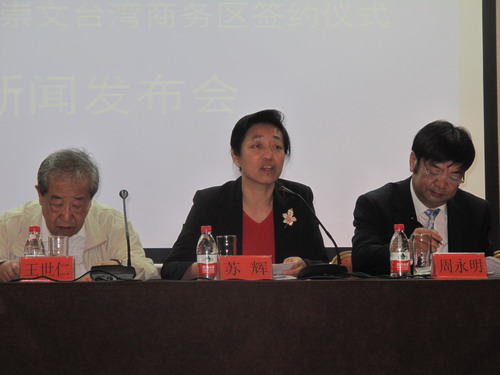 北京市臺(tái)聯(lián)會(huì)長(zhǎng)蘇輝(中)、北京市崇文區(qū)副區(qū)長(zhǎng)周永明(右)在記者會(huì)上介紹臺(tái)灣會(huì)館和臺(tái)灣商務(wù)區(qū)的相關(guān)情況。