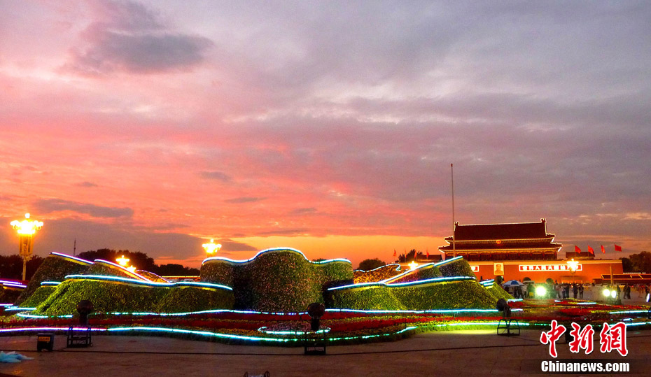 9月21日傍晚,北京天安門廣場(chǎng),剛剛布置完畢的國慶中心花壇首次調(diào)試景觀照明,綻放的“牡丹”與晚霞交相輝映。 中新社發(fā) 玉龍 攝 圖片來源:cnsphoto