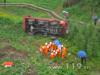 6月20日12時21分,六盤水市鐘山區(qū)消防特勤中隊接到指揮中心調(diào)度,稱南環(huán)路桃園山莊下發(fā)生一起交通事故,有兩人被困。消防中隊接到調(diào)度命令后,立即出動9名消防官兵乘坐一臺搶險救援車趕往事故現(xiàn)場實施救援。消防官兵到達事故地點通過勘查發(fā)現(xiàn),一輛中型貨車側(cè)翻在公路下玉米地里,車頭已嚴重變形,包括駕駛員在內(nèi)兩名被困人員均未被車卡住,且神志清醒,能夠積極配合營救工作。消防官兵下達山坡玉米地后,兩名被困人員已被先到現(xiàn)場當?shù)厝罕姾?20醫(yī)務(wù)人員抬至擔架上。消防指揮員根據(jù)現(xiàn)場情況,立即下達救援方案,利用救援繩小心的將受傷駕駛員和另一名受傷婦女固定在救援擔架上,并迅速抬至公路上的120急救車,由于方法得當,整個過程進展順利,經(jīng)過近20分鐘的緊張救援,兩名被困人員被成功抬上120急救車。